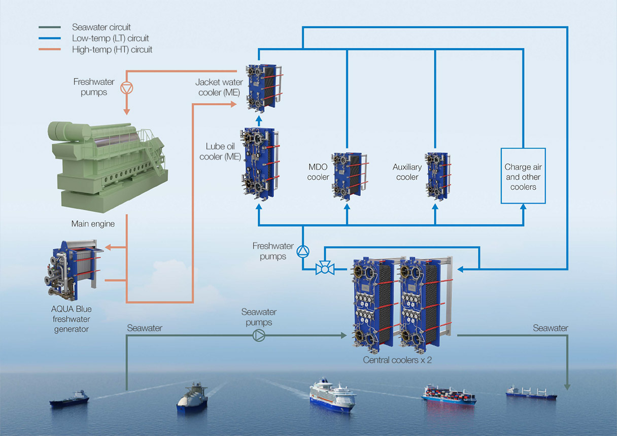 A portion of the excess heat generated in the jacket water circuit is used to generate fresh water in the Alfa Laval AQUA Blue freshwater generator.