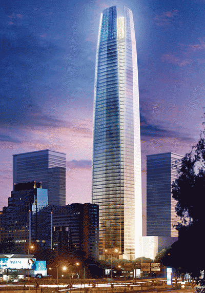 Costanera Center in Santiago, Chile is 300 metres high and an area of 280 000 square metres. The owner of the tower is Censocud.